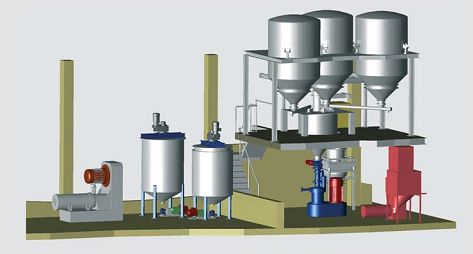 通過投料系統(tǒng)、上料系統(tǒng)、稱重系統(tǒng)、漿料輸送系統(tǒng)、過濾系統(tǒng)、除磁系統(tǒng)、預(yù)混系統(tǒng)、均質(zhì)系統(tǒng)、研磨系統(tǒng)、儲存系統(tǒng)、罐裝系統(tǒng)等組成濕法研磨生產(chǎn)線。