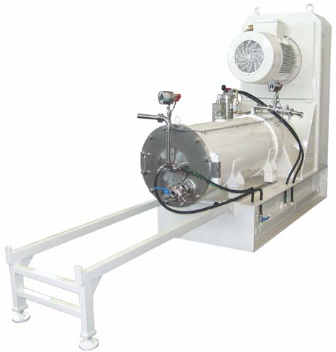 Development of the first continuous agitator bead mill Product inlet via rotor / immersion tube system prevents back flow of grinding media into the feed line.