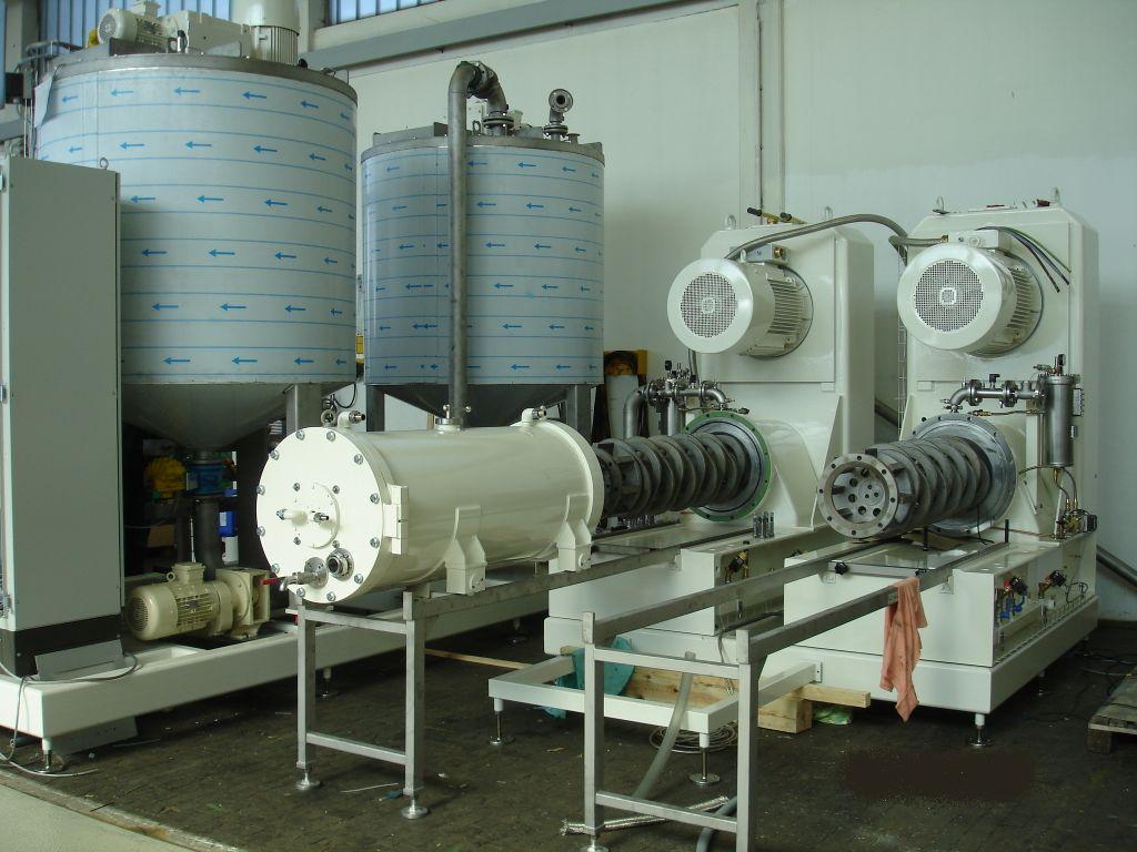 Development of the first continuous agitator bead mill Product inlet via rotor / immersion tube system prevents back flow of grinding media into the feed line.