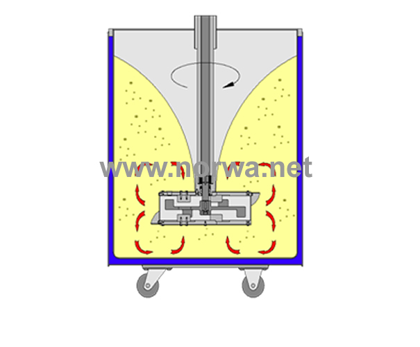 ●研磨過(guò)程中,籃子旋轉(zhuǎn)。由流體力學(xué)設(shè)計(jì)物料從上下部分吸入裝有研磨介質(zhì)的籃子內(nèi),研磨后的物料 在離心力作用下從周邊縫隙甩出