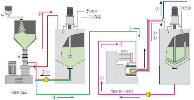 經(jīng)過充分潤濕通過進(jìn)料泵投入到研磨腔中,為達(dá)到理想的粒度要求,特別是對(duì)顆粒度的細(xì)度或比表面積要求特別細(xì)的條件,經(jīng)過多次的往復(fù)循環(huán)剪切,達(dá)到所需的產(chǎn)品性能,研磨中注意研磨能量的輸入、研磨介質(zhì)的選擇、研磨溫度等影響和評(píng)估。如:鈦酸鋰、磷酸鐵鋰、色漿、隔熱涂料、番茄紅素等